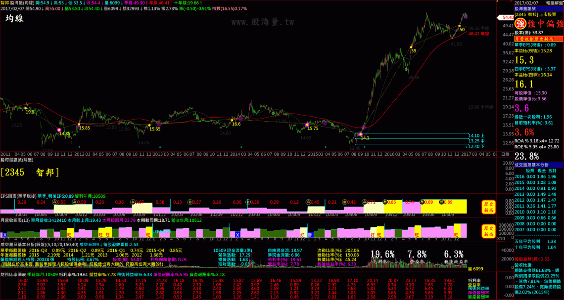 一目了然,完整結合基本面、技術面與籌碼面的情報於一張圖表上,幫助你輕輕鬆鬆,瞬間判讀個股的好壞與強弱。重要的關鍵訊號都會在情報區以大字提示,讓你即時掌握,絕不錯過。